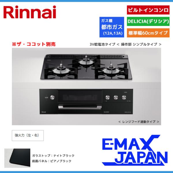 リンナイ ビルトインコンロ DELICIA デリシア 3口 3V乾電池タイプ ココット別売 都市ガス 13A 60cm クリスタルブラック RHS31W30E11RABW-13A