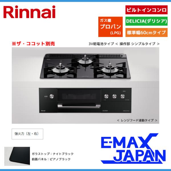 リンナイ ビルトインコンロ DELICIA デリシア 3口 3V乾電池タイプ ココット別売 プロパンガス 60cm LPG クリスタルブラック RHS31W30E11RABW-LPG