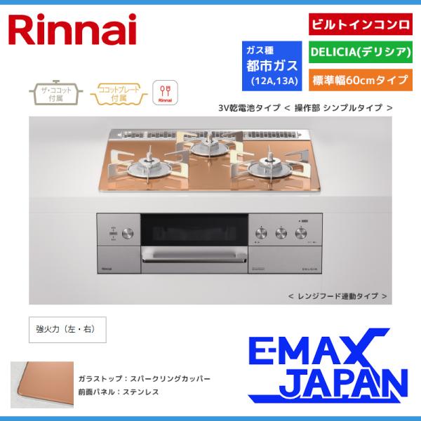 リンナイ ビルトインコンロ DELICIA デリシア 3口 3V乾電池タイプ シンプルタイプ 都市ガス 13A 60cm スパークリングカッパー RHS31W30E12RCASTW-13A