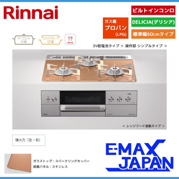 リンナイ ビルトインコンロ DELICIA デリシア 3口 3V乾電池タイプ シンプルタイプ プロパンガス 60cm LPG スパークリングカッパー RHS31W30E12RCASTW-LPG