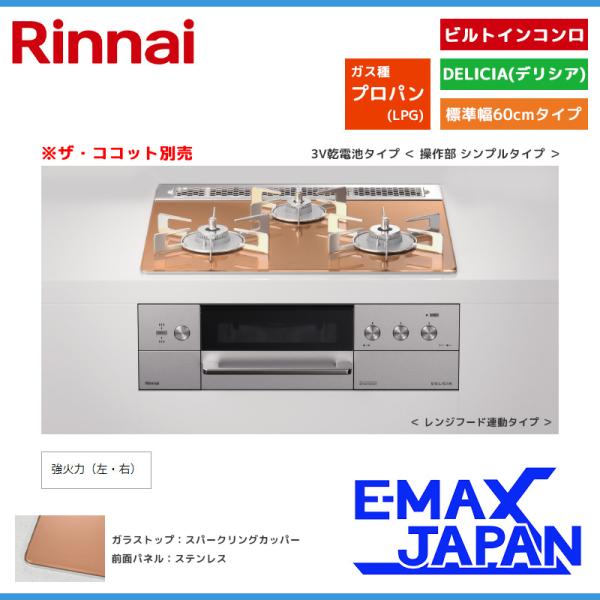 リンナイ ビルトインコンロ DELICIA デリシア 3口 3V乾電池タイプ ココット別売 プロパンガス 60cm LPG スパークリングカッパー RHS31W30E12RASTW-LPG