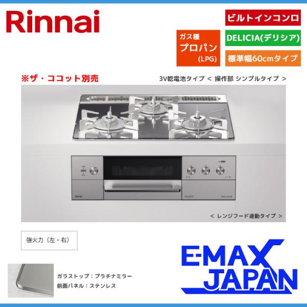 リンナイ ビルトインコンロ DELICIA デリシア 3口 3V乾電池タイプ ココット別売 プロパンガス 60cm LPG プラチナミラーD RHS31W30E13RASTW-LPG