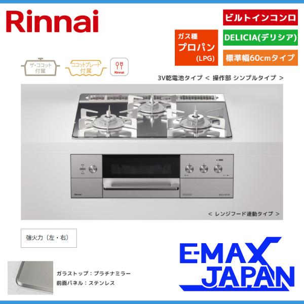 リンナイ ビルトインコンロ DELICIA デリシア 3口 3V乾電池タイプ シンプルタイプ プロパンガス 60cm LPG プラチナミラーD RHS31W30E13RCASTW-LPG