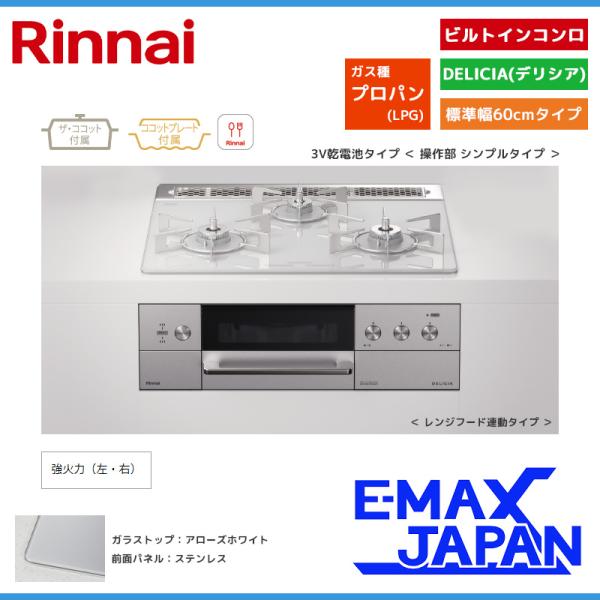 リンナイ ビルトインコンロ DELICIA デリシア 3口 3V乾電池タイプ シンプルタイプ プロパンガス 60cm LPG アローズホワイト RHS31W30E14RCASTW-LPG