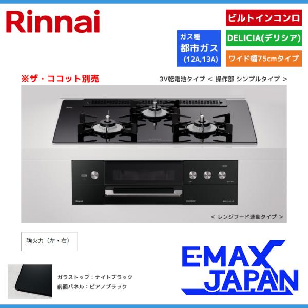 リンナイ ビルトインコンロ DELICIA デリシア 3口 3V乾電池タイプ ココット別売 都市ガス 13A 75cm クリスタルブラック RHS71W30E11RABW-13A