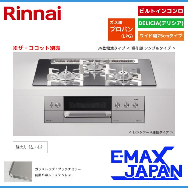 リンナイ ビルトインコンロ DELICIA デリシア 3口 3V乾電池タイプ ココット別売 プロパンガス 75cm LPG プラチナミラーD RHS71W30E13RASTW-LPG