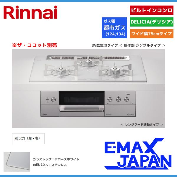 リンナイ ビルトインコンロ DELICIA デリシア 3口 3V乾電池タイプ ココット別売 都市ガス 13A 75cm アローズホワイト RHS71W30E14RASTW-13A
