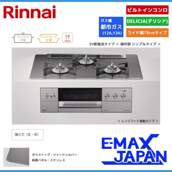 リンナイ ビルトインコンロ DELICIA デリシア 3口 3V乾電池タイプ シンプルタイプ 都市ガス 13A 75cm ツイードシルバー RHS71W30E15RCASTW-13A