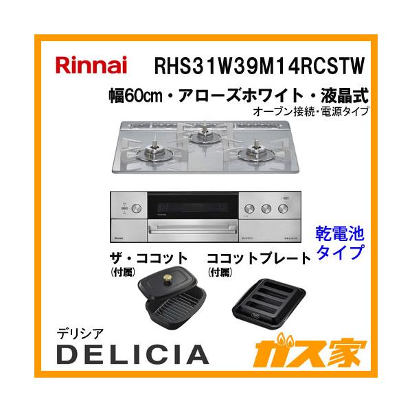 リンナイ RHS31W39M14RCSTW ガスビルトインコンロ デリシア 3V乾電池 操作部液晶付 アローズホワイト オーブン接続タイプ 60cm