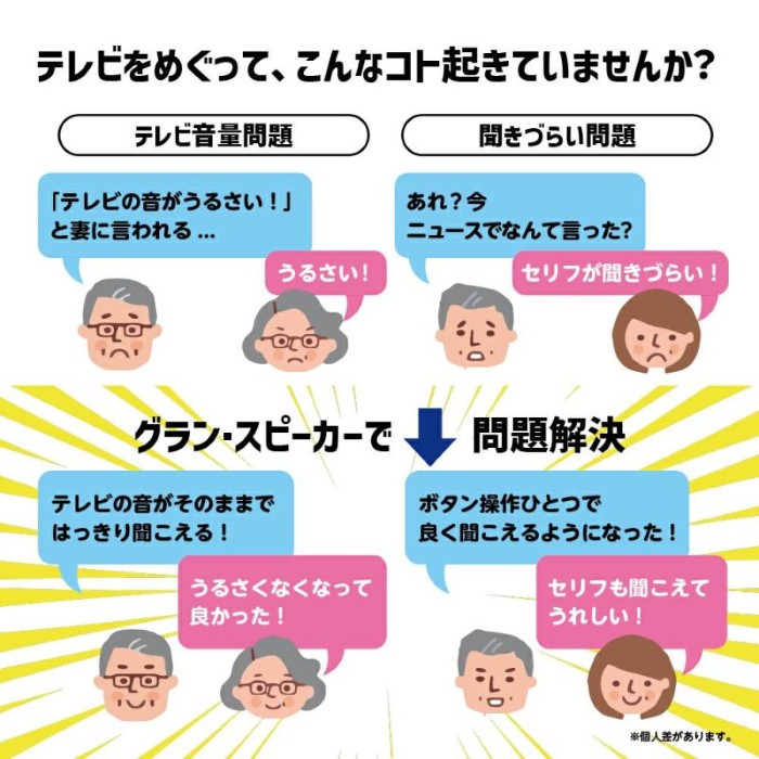 - DOSHISHA(ドウシシャ) グランスピーカー(GRAND・SPEAKER) GS-SP1 ドウシシャ スピーカー テレビ 高齢者 グランスピーカー GS-SP1 有線 TV テレビ用スピーカー TV用スピーカー テレビ用 お年寄り シニア 補聴 手元 耳元 ホームシアター 映画 音楽 コンパクト 敬老の日 DOSHISHA GRAND・SPEAKER 「GRAND・SPEAKER(グランスピーカー) GS-SP1」は、高齢者にも聞き取りやすいテレビ用スピーカーでありながら、迫力ある音質を両立することで音楽番組や映画も楽しめます。サウンドバーのようにコンテンツに合わせたサウンドモードを5つ搭載。大きなボタンが使いやすいリモコン付きで、ご年配の方でも安心して操作可能。工事不要でケーブル1本で簡単に接続が可能です。 INFORMATION 高齢者への聞き取りやすさと迫力ある音質を両立したテレビ用スピーカー。サウンドモードを5つ搭載し、様々なコンテンツを楽しめます。使いやすいリモコン付き。 KEYWORD スピーカー テレビ 高齢者 有線 TV テレビ用スピーカー TV用スピーカー テレビ用 お年寄り シニア 補聴 手元 耳元 ホームシアター 映画 音楽 コンパクト 敬老の日 ギフト プレゼント 母の日 父の日 クリスマス クリスマスプレゼント お返し 誕生日プレゼント ドウシシャ グランスピーカー DOSHISHA GRAND・SPEAKER GS-SP1 製品特徴●声がくっきり聞こえる設計ホーンスピーカー+ウーファーのハイブリッド構造で、高齢者でもテレビの声を聞き取りやすい。●5つのサウンドモード搭載ニュース・映画・音楽など、シーンに合わせて最適な音質を選べます。●簡単接続・工事不要テレビのイヤホン端子にケーブル1本つなぐだけで、すぐに使えます。●リモコン付きで操作も簡単大きなボタンのワイヤレスリモコンで高齢者でも直感的に操作可能。●家族みんなが快適に楽しめる声の聞き取りやすさと迫力ある音質を両立し、全世代に最適なスピーカー。★ ご注意 ★商品のお届けに関する重要なお知らせ 簡単レシピ・ライフハック などをブログでご紹介!AQUA RECORD 豪華特典付き( 特典の詳細はページ下部 ) DOSHISHA(ドウシシャ) グランスピーカー(GRAND・SPEAKER) GS-SP1家族みんなが満足 聞きやすく迫力◎のTVスピーカー「GRAND・SPEAKER(グランスピーカー) GS-SP1」は、高齢者にも聞き取りやすいテレビ用スピーカーでありながら、迫力ある音質を両立することで音楽番組や映画も楽しめます。サウンドバーのようにコンテンツに合わせたサウンドモードを5つ搭載。大きなボタンが使いやすいリモコン付きで、ご年配の方でも安心して操作可能。工事不要でケーブル1本で簡単に接続が可能です。●声がくっきり聞こえる設計ホーンスピーカー+ウーファーのハイブリッド構造で、高齢者でもテレビの声を聞き取りやすい。●5つのサウンドモード搭載ニュース・映画・音楽など、シーンに合わせて最適な音質を選べます。●簡単接続・工事不要テレビのイヤホン端子にケーブル1本つなぐだけで、すぐに使えます。●リモコン付きで操作も簡単大きなボタンのワイヤレスリモコンで高齢者でも直感的に操作可能。●家族みんなが快適に楽しめる声の聞き取りやすさと迫力ある音質を両立し、全世代に最適なスピーカー。 商品仕様●サイズ幅41×奥行14.2×高さ7cm●重量約1kg●電源ACアダプター AC100V 50/60Hz 出力 DC9V/3A●消費電力動作時:20Wスタンバイ時:0.5W●使用温度範囲0℃〜 40℃●アンプ出力(THD10%)ホーンスピーカー:5W+5Wウーファースピーカー:5W+5W2デジタルアンプ総合:20W●スピーカードライバーホーン:38mmフルレンジ インピーダンス4 Ωウーファー:50mmフルレンジ インピーダンス4 Ω●入力端子AUX 3.5Φ ステレオミニ入力●同梱物リスト本体、リモコン(動作確認用CR2032付)、ACアダプター、ステレオミニプラグケーブル(2m)●保証期間1年●注意・取扱説明書および添付文書を充分にご確認になり、安全にご使用ください・ご使用のモニタにより、色の見え方が異なる場合がございます お探しのものは見つかりましたか人気商品の特集一覧はこちらGLOBAL包丁特集はこちら扇風機特集はこちら