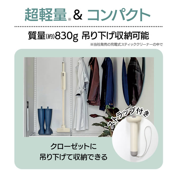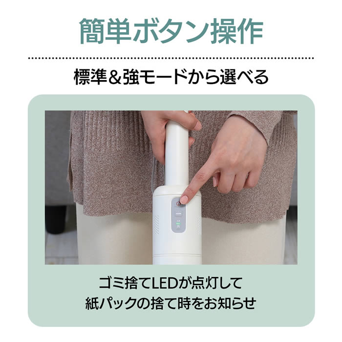 - 紙パック式軽量掃除機(MASIC LIGHT2) 超軽量830g&コンパクト。手を汚さず簡単紙パック交換! コードレスで紙パック式の軽量掃除機 ◆超軽量※&コンパクト 質量(約)830g 吊り下げ収納可能 ※当社発売の充電式スティッククリーナーの中で ◆手を汚さない紙パック式 ゴミが紙パックにたまるからそのまま捨てられる ◆簡単ボタン操作 標準&強モードから選べる ◆4WAY仕様 パーツを付け替えて様々な用途で使用可能 ◆狭い隙間にも 薄型先端フロアヘッドだから狭い隙間でも使いやすい 商品仕様 商品名 紙パック式軽量掃除機(MASIC LIGHT2) 型番 DSV-025P 電源 DC 5V 2A(USB Type-C) 使用電池 リチウムイオン電池 DC11.1V 充電時間 4.0時間(電池が空状態から充電を開始/室温20度)(出力DC 5V 2Aの電源使用時) 使用時間 強:10分 標準:25分(使用初期、満充電状態から使用/室温20度) 集塵容量(約) 0.2L:紙パック 外形寸法(約) W20.8 × D8.5 × H111.2 cm(本体+延長パイプ+フロアヘッド) W20.8 × D11.5 × H104.2 cm(本体+延長パイプ+フロアヘッド)※縦置き時 W8.5 × D7.5 × H48.0 cm(本体) 質量(約) 0.83 kg(本体+延長パイプ+フロアヘッド) USBケーブル長さ(約) 1.5 m 付属品 ブラシ付すきまノズル×1、取扱説明書・保証書×1、USBケーブル×1、紙パック×4(1枚装着済) 原産国 中国 <検索用キーワード> おしゃれ オシャレ かわいい カワイイ 大人可愛い 対応 人気 おすすめ 実用的 プレゼント ギフト 誕生日 贈り物 父の日 母の日 敬老の日 クリスマス バレンタイン 新生活 引越し お祝い お返し紙パック式軽量掃除機MAGIC LIGHT II 11,880円(税込) パワーブラシ付軽量掃除機スリム 12,980円(税込) 布団乾燥機 ふとんジェットR500 14,080〜16,280円(税込) 布団乾燥機 ふとんジェットダブルブロー 19,580円(税込) ミニアイロン 1,628円(税込) ミニスチームアイロン 2,508円(税込) スチームアイロン 3,058円(税込) コンパクト炊飯器 3,608円(税込)