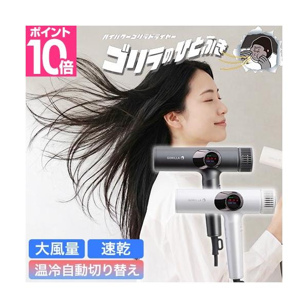 ゴリラ ドライヤー 時短 ゴリラのひとふき ドライヤー 時短 大風量 ツヤ髪 冷温自動切り替え 速乾 軽量540g 1200w パワフル 爆風 お手入れ簡単 ノズルつき