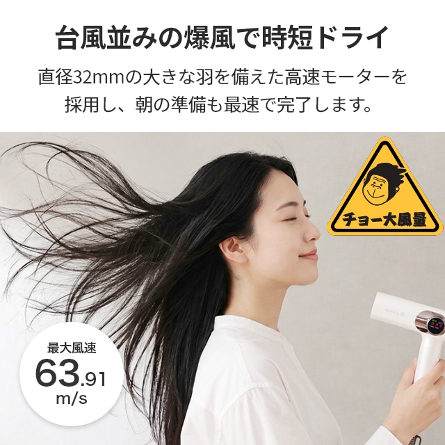 マイナスイオン搭載で、仕上がりは驚くほどしっとりツヤ髪に。速乾もケアもこの一台で叶えます。