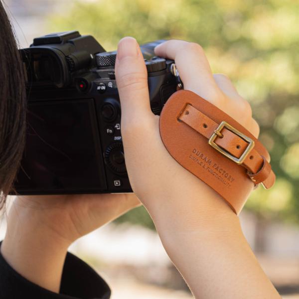 ベジタブルタンニンレザーを使用したハンドストラップ。手首を締めつけない設計でカメラ操作時のストレスを軽減し、快適な撮影をサポートします。ストラップの長さはピンの位置で調整でき、付属のホックパーツを手首の方向に動かすことでホールド感を高めることができます。また、ストラップを装着したままメモリーカードやバッテリーの交換が可能。カメラ底面のネジ穴もふさがないため、雲台や三脚への取り付けもスムーズです。一眼レフやミラーレスにぴったりなカメラストラップです。