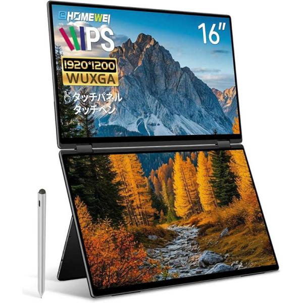 - EHOMEWEI デュアルディスプレイ モバイルモニター タッチパネル 16インチ 1920*1200 IPS 折りたたみ ミラーリング 拡張 薄型 6mm XQ-160PF・✅【画面の結合・分離が可能な16インチデュアルモバイルモニター】2つの画面の結合や分離が出来る、折りたたみ式16インチデュアルモバイルモニターです。ネイティブ解像度は1920 x 1200。IPS技術により色の精度が高く、従来の液晶パネル(LCD)で見られるバックライトのにじみがありません。色域は100% sRGB。画面を結合して大画面でネットサーフィンをしたり、モニターを分離して各々の独立モニターとして使用することができます。・✅【持ち運びに特化したデザイン】最薄部6mmで画面を折りたたむことで付属のモニターケースに収納し、どこへでも持ち運べます。ドライバ等のインストールは不要で、付属のケーブル接続ですぐに使えます。※接続デバイスによっては出力電力が足りず、思わぬ動作を起こす可能性がございます。電源供給(15W以上)を推奨しております。ポート付スタンドが本体と直結しております。締め付けすぎず緩すぎない絶妙な取り付けにより、角度調整もスムーズに行えてラクラク設置できます。内側に接続ポートがある設計のため、ケーブルもすっきりと収納可能。ビジネス利用ではミラーリング表示で対面で画面共有が出来るので効率的な商談ができます。ボディ素材には耐久性が高く、高級感のあるCNCメタルを使用。・✅【タッチペン対応・仮想キーボード・その他の嬉しい機能が満載!】タッチペン対応タッチパネル内蔵によりペンタブのような使い方が可能です。上の画面を参考にして下の画面でPDF等の書類にメモ書きが出来ます。指でのタッチも勿論対応しており、まるでスマホのような指によるタッチ操作が可能です。WinddowsやAndroid対応は勿論、他社にはないMacOSに対応したタッチモニターです。※Macbookデバイスに関しましてはデバイスの仕様上、筆圧検知は出来かねてしまいます。ディスプレイ上で指での操作を行うことで仮想キーボードを起動できます。PCとモニターを行き来する必要がなくなります。Nintendo Switch/PS4/PS5/Xbox/その他ゲーム機等はタッチ非対応です。明るさの幅を広げ、より自然でリアルな描写が可能となるHDRモード。その他、明るさ、色温度、ブルーライトカットや言語設定をボタン操作で簡単に行えます。リフレッシュレートは60Hzです。※タッチキーボードはUS配列対応のみとなっております。・✅ 【iPhone15とケーブル一本で接続可能】iPhone15(TypeCポート)に付属のケーブル一本で接続することでディスプレイ表示ができ、さらにタッチ操作が可能です。iPadやAndroidスマートフォンとの接続にも対応。スマホの画面が小さすぎて見えないという方や、複数人に画面を共有する場合に大変お役立ちできます。※画面出力対応のデバイスが必要です。仕様につきましては各スマホによって異なるため、販売元にお問い合わせくださいませ。・✅【付属品・安心サポート】付属品 モニターケース/マニュアル/タッチペン(充電式)/保護フィルム/ケーブル各種(TypeC-TypeC/ HDMI-MiniHDMI /USB Type-A)/電源アダプタ メーカー3年間保証。製品使用中に不具合、その他のテクニカルな問題が発生しましたらお気軽にお問い合わせくださいませ。【トラブルシューティング】Q1.画面が映らない、ちらつく。 A1. モニター本体に15W以上の電源供給を行ってください。Q2. タッチ機能が使えない。 A2. 接続先デバイスのTypeCポートがAlt mode (Thunderbolt3)規格以上である必要がございます。非対応の場合、HDMIケーブルに加えてTypeAケーブルを同時に接続してください。 Q3. タッチ操作がずれる。 A3. モニターをPCと接続後「コントロールパネル(ハードウェアとサウンド)」→「タブレットPC設定」よりタッチ位置の調整を行ってください。※※ご不明点がございましたら商品ページの「販売元」のリンクよりお問い合わせくださいませ。ブランド: EHOMEWEIメーカー: EHOMEWEI型番: XQ-160PFJAN: 4595986671369