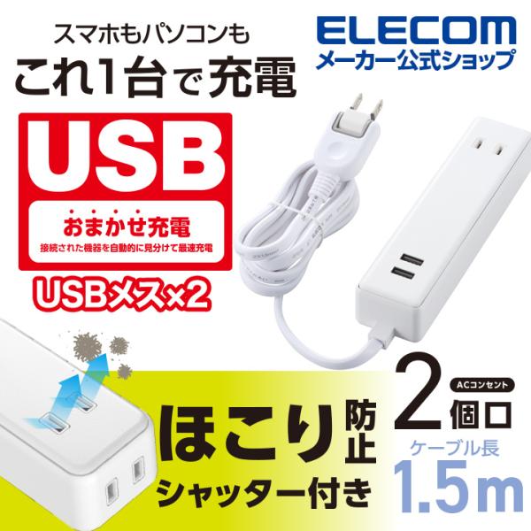 モバイル USBタップ ケーブル iphone スマホ 充電器 2口 + 2ポート 電源タップ 延長コード ホワイト 1.5m┃MOT-U09-2215WH エレコム 在庫処分