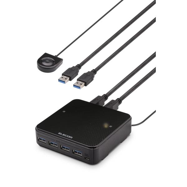 - マウスやキーボード、USBメモリ、ドッキングステーションなど、4台のUSBデバイスを2台のパソコンで切り替えて使用できるUSB3.0対応切替機です。※ドッキングステーションはディスプレイの出力には対応しておりません。USB3.1/3.0のスーパースピードモード(5Gbps※規格値)に対応しており、対応したUSBメモリやHDDなどを共有するのに適しています。ノートパソコンとデスクトップパソコンなど、パソコン2台でUSBデバイスを共有でき、省スペースを実現します。4台のUSBデバイスを共有可能で、USBハブを接続することにより4台以上のUSBデバイスを共有することも可能です。【 仕様 】 ■サイズ:幅94 mm ×奥行93 mm ×高さ27 mm ■重量:約120 g ■規格:USB3.0 ■インターフェース:USB ■ダウンストリームポート:4(USB Type A/デバイス側) ■アップストリームポート:2(USB Type B/PC側) ■Self power:○ ■BUS power:○ ■対応OS:Windows 10、Windows 8.1、Windows 7、macOS Mojave(10.14) ※各OSの最新バージョンへのアップデートや、サービスパックのインストールが必要になる場合があります。 ■電源:USBバスパワー※電力不足の場合は、micro USB タイプの電源ジャックからの給電が可能です。ケーブル等は別途ご購入ください。 ■最大通信速度:5Gbps ■付属品:USBケーブル(1.2m ※コネクター含む) ×2、手元スイッチ×1、ユーザーズマニュアル×1 【 説明 】 ■マウスやキーボード、USBメモリ、ドッキングステーションなど、4台のUSBデバイスを2台のパソコンで切り替えて使用できるUSB3.0対応切替機です。 ■※ドッキングステーションはディスプレイの出力には対応しておりません。 ■USB3.1/3.0のスーパースピードモード(5Gbps※規格値)に対応しており、対応したUSBメモリやHDDなどを共有するのに適しています。 ■ノートパソコンとデスクトップパソコンなど、パソコン2台でUSBデバイスを共有でき、省スペースを実現します。 ■4台のUSBデバイスを共有可能で、USBハブを接続することにより4台以上のUSBデバイスを共有することも可能です。 ■離れた場所でも切替ができる手元スイッチが付いています。 ■選択しているパソコンが確認できる動作PC確認ランプが付いています。 ■本製品とパソコンを接続するUSB[A]-USB[Bタイプ]ケーブルが2本付属しています。 ■電力不足の場合に給電できるUSB microBポートが付いています。USB AC給電アダプター(1.8A以上の電流が供給可能なもの)を使って給電可能です。 ■※接続ケーブルおよびUSB AC給電アダプターは付属していません。 ■Windowsパソコンだけでなく、Macintoshにも対応しています。 ■専用ドライバなどのインストールは不要で、接続するだけですぐに使用可能です。 【商品に関するお問い合わせ】 エレコム総合インフォメーションセンター TEL. 0570-084-465 FAX. 0570-050-012 受付時間 / 10:00~19:00 年中無休