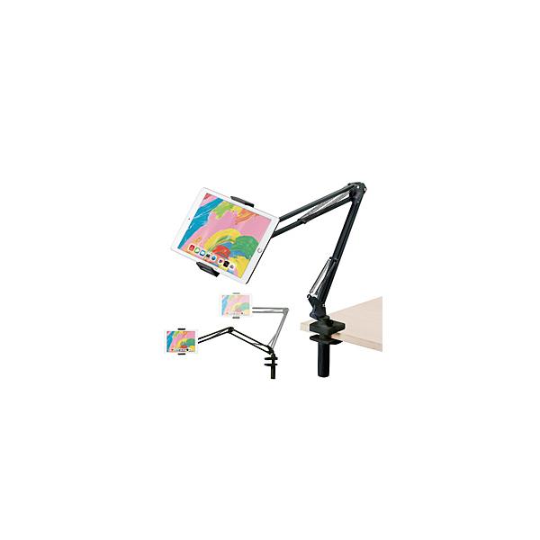 - デスクやベッドサイドでの使用に最適。長いフレキシブルアームとボールジョイントでタブレットを自在に位置調整できるタブレット用フレキシブルアームスタンド。