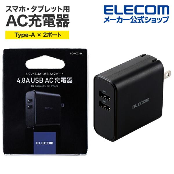 エレコム スマートフォン・タブレット 用 AC充電器 24W Type-Aポート ×2 スマホ タブレット AC 充電器 4.8A出力 USB-Aメス2ポート ブラック┃EC-AC03BK