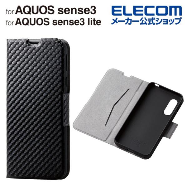 AQUOS sense3 用 AQUOS sense3 lite 用 ソフトレザー アクオス SH-RM12 カバー 手帳型 薄型 磁石付 カーボン調(ブラック)┃PM-AQS3PLFUCB エレコム 在庫処分