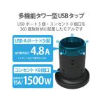 - 【仕様】●差込口8口とUSBポート5口が一体となったタワー形状のUSBタップです。●USBポートを備えることで、ACアダプタを利用することなくスマートフォンやタブレットをパソコンと同時に充電できます。●差込口には未使用時にほこりの侵入を防止する「ほこり防止シャッター」を装備しています。●差込口には万一の発熱の際にも融解しにくく、電気火災の防止に有効な耐熱性に優れた熱硬化性樹脂を使用しています。●差込口は階層ごとに45度ずらした配置になっているため、ACアダプタなど大きなプラグを接続しても他の差込口に干渉しにくいです。●誘導雷による最大12500Vまでの雷サージを吸収する素子(バリスタ)を搭載し、接続機器を保護します。(※最大サージ電圧12500VはJEC210/212規格に基づく数値です。受けた電圧や回数により性能は劣化します。)●(一社)日本配線システム工業会規格(JWDS0010)に適合した二重被覆コードを採用。断線や被覆破れによる感電や火災の防止に有効です。●ケーブルは下方向への取り出しの他、底面の溝を利用して横方向にも取り出せるようになっています。●ケーブルを横から取り出す