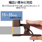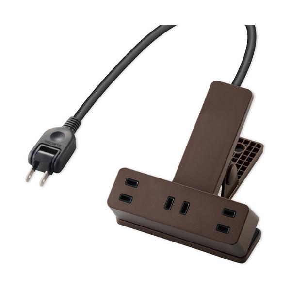- エレコム T-KF03-2325BR クリップタップ 雷サージ付 ホコリシャッター付 3個口 スイングプラグ 2.5m ブラウン ●机などに挟んで利用することができるクリップ機構を搭載した2ピン式の3個口タップです。固定使用だけでなく、タップを常設できないダイニングテーブルなどでテレワークや宿題をする際に、一時的に設置して利用するのにも便利です。コードの長さは2.5mです。●15mm〜35mmの厚さの板に設置が可能です。設置する際は差込口が上向きになるようにしてください。●板との接地面はラバー仕様となっており、傷防止や滑り止め効果があります。【仕様】本体差込口形状:2ピン本体差込口個数:3個口プラグ仕様:2ピンコード長:2.5m定格:125V/15A/1500Wまで雷ガード:○ほこりシャッター:○絶縁キャップ付きプラグ:○二重被ふく:○スイングプラグ:○固定方法:クリップ(15mm〜35mmに対応)や吊り穴(φ10mm)を利用した仮固定が可能。カラー:ブラウン材質・本体:ABS樹脂・プラグ、PVC 差込口:ユリア樹脂外形寸法:幅110mm×奥行140mm×高さ80mm ※コード部分及びプラグ部分を除く質量:約300g使用可能地域:日本国内専用電気用品安全法:PSE適合保証期間:1年