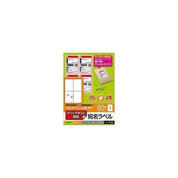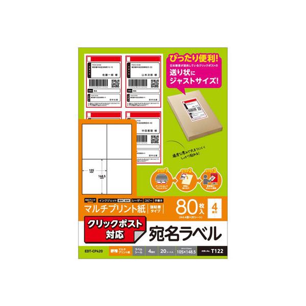 - [エレコム クリックポスト対応ラベル EDT-CP420 [EDTCP420]] の商品説明●日本郵便株式会社が提供しているクリックポストの送り状サイズに対応したラベルシールです。●はがして貼るだけのシールなので、はさみで切ったり糊を使う必要がありません。●インクジェットプリンタ、レーザープリンタ、コピー機でも印刷できるマルチタイプのラベルです。●適度な厚みで丸まりにくく、しっかり貼れる強粘着タイプです。[エレコム クリックポスト対応ラベル EDT-CP420 [EDTCP420]]のスペック●用紙サイズ:幅210mm×高さ297mm ※A4サイズ●一面サイズ:105mm ×148.5mm●ラベル枚数:80枚 ※20シート×4面●用紙タイプ:マルチプリント紙●カラー:ホワイト●紙厚:0.15mm●坪量:132g/m2●テストプリント用紙:テストプリント用紙1枚入り●お探しNo.:T122●セット内容:ラベル×20シート、テストプリント用紙×1枚●その他:面付:4面○返品不可対象商品