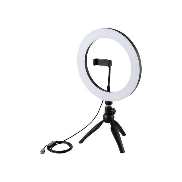 - ■撮影・オンライン会議に最適なスタンドタイプのリングライトです。室内でも明るく撮れるようになり「暗くて顔がよく見えない」を解決します。 動画撮影や配信の際に必須のキャッチライト。リング状の光が瞳に映り、輝きのある表情を演出することができます。 撮影シーンにあわせてリモコンで昼光色、電球色、昼白色の3色を選ぶことができます。 暗い部屋など、状況に応じてリモコンで10段階の明るさ調整をすることができます。リモコンはケーブルの途中にあるため、手元で簡単に操作が可能です。 リングの直径はしっかり使える26cmです。 明るさは約95ルーメン〜1100ルーメンです。(理論値) 2800K〜6700Kの相関色温度(CCT)を備えています。また演色性もJIS規格で推奨されているRa80を満たしているため、くっきり鮮明な色彩を再現します。 360°ボールジョイントを搭載、ライト角度の微調整が可能です。 リングの中央にはスマートフォンホルダーが付いています。幅約52mm〜85mm、厚み約12mmまでのスマートフォンを設置可能です。 1/4インチネジに対応しており、お手持ちの三脚に取り付ける事も可能です。 接続端子はUSB-Aコネクタを採用、手持ちの5V/2.4AのAC充電器やモバイルバッテリーで使用が可能です。
