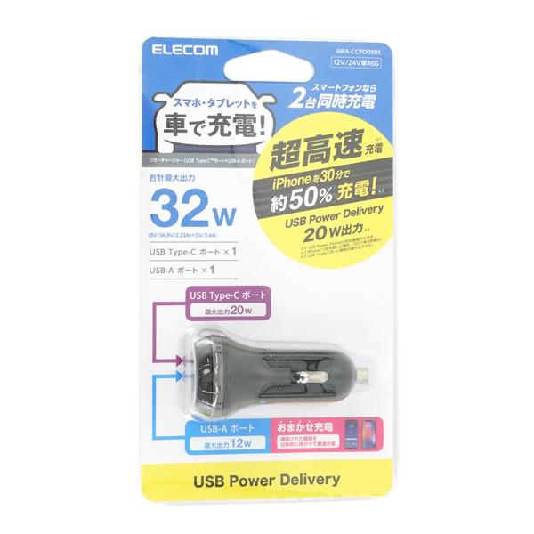 - 【商品名:】ELECOM シガーソケット用 USBカーチャージャー MPA-CCPD08BK ブラック / 【商品状態:】新品 / 【検索用キーワード:】≪即納≫ MPA-CCPD08BK [ブラック] / 【型番:】 MPA-CCPD08BK [ブラック] / 【商品説明:】 USB Power Delivery規格に準拠したUSB Type-C(TM)(USB-C(TM))ポートとUSB-Aポートを搭載し、合計最大出力32Wでスマートフォンなど2台を車で充電できる車載充電器。 /