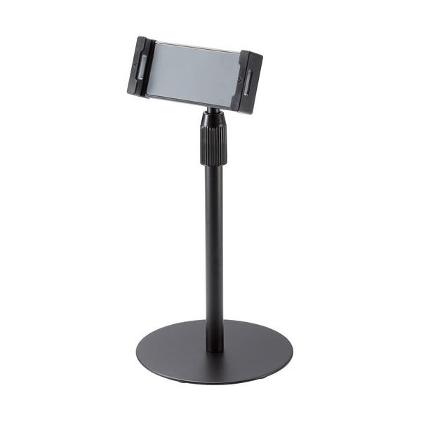 - ■目線の高さに端末を設置でき、端末をサブディスプレイとしてテレワークやオンライン学習で活用できる、スマートフォン、タブレット用スタンドです。 ■端末をホルダーに固定することで目線に垂直に端末を設置できる固定型です。 ■アジャスターで高さ調節がラクラク可能です。 ■ホルダー部はボールジョイント付で、フリーアングルに角度調節が可能。シーンに合わせて好みの角度で使用できます。 ■およそ4.7〜12.9インチのスマートフォン、タブレットに対応しています。 ■ホルダー部には滑り止めクッションが付いています。 ■ホルダー部の受け部分は中心が開いており充電ケーブルが接続しやすくなっています。 ■底面にはクッションパーツ付で、金属の土台が直接家具などに触れないようになっています。■外形寸法:高さ約354〜524mm(土台からホルダー最上部まで)、直径約180mm(土台)、幅約147mm×厚み約28mm×高さ約65mm(ホルダー) ■材質:スチール、ABS ■重量:約1000g ■カラー:ブラック ■対応機種:4.7〜12.9インチ(W215mm×D8.5mm×H281mmまで) ■角度調節:○ ■付属品:六角レンチテレワークやオンライン学習に最適!高さ調節可能で目線の高さに合わせて端末を垂直に固定できるスマートフォン、タブレット用スタンドです。
