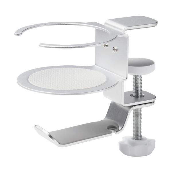 - ■作業スペースを確保しながらヘッドホンとドリンクを収納できる、ドリンクホルダー付きのヘッドホンスタンドです。■ヘッドホンとドリンクをまとめて収納できる、ドリンクホルダー付きのヘッドホンスタンドです。 ■ヘッドホンのハンガー部は360度回転可能でデスク下に収納できるので、使用したいときだけデスク下からヘッドホンを取り出すことができます。 ■クランプ式で、デスク下にしっかり取り付けられます。 ■天板厚み約50mmまでのデスクに対応します。 ■直径約70mmまでのドリンクを置くことができます。 ■ハンガー部にはプラグやコードを引っ掛けることができるフックが付いています。■材質:アルミ、シリコン■外形寸法:幅約85mm×奥行約135mm×高さ約95mm■重量:約170g■カラー:シルバー■対応機種:ヘッドバンド幅約50mm以下のヘッドホン■耐荷重:約9kgエレコムダイレクトショップ作業スペースを確保しながらヘッドホンとドリンクを収納できる、ドリンクホルダー付きのヘッドホンスタンドです。ヘッドホンとドリンクをまとめて収納できる、ドリンクホルダー付きのヘッドホンスタンドヘッドホンとドリンクをまとめて収納できる、ドリンクホルダー付きのヘッドホンスタンドです。360度回転可能でデスク下に収納できるヘッドホンのハンガー部は360度回転可能でデスク下に収納できるので、使用したいときだけデスク下からヘッドホンを取り出すことができます。プラグやコードを引っ掛けることができるフック付きハンガー部にはプラグやコードを引っ掛けることができるフックが付いています。しっかり取り付けられるクランプ式クランプ式で、デスク下にしっかり取り付けられます。天板厚み約50mmまでのデスクに対応します。直径約70mmまでのドリンクに対応直径約70mmまでのドリンクを置くことができます。