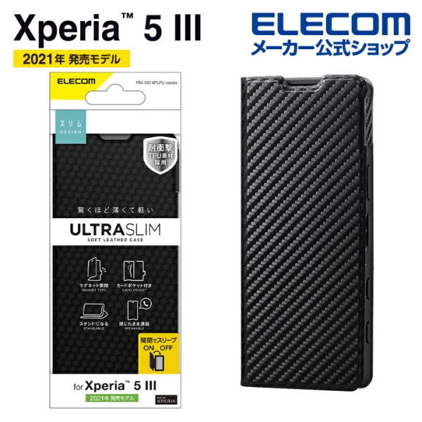 Xperia 5 III 用 ソフトレザーケース 薄型 磁石 Xperia5 エクスペリア 5 iii カバー 手帳型 UltraSlim カーボン調ブラック┃PM-X214PLFUCB エレコム 在庫処分
