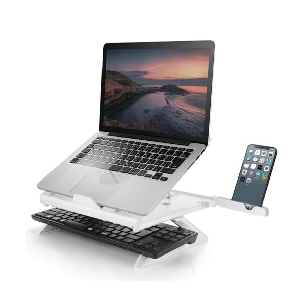 ・8段階角度調整機能と高さアップ脚付の折りたたみ式ノートパソコンスタンドです。 ノートパソコンスタンドの左右にあるスマートフォンスタンド機能により、パソコンとスマートフォンの画面を並べて見ることができます。