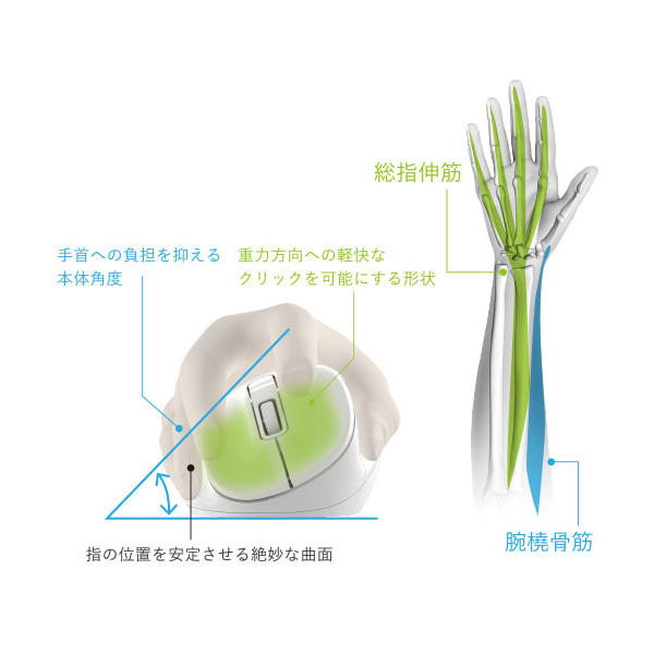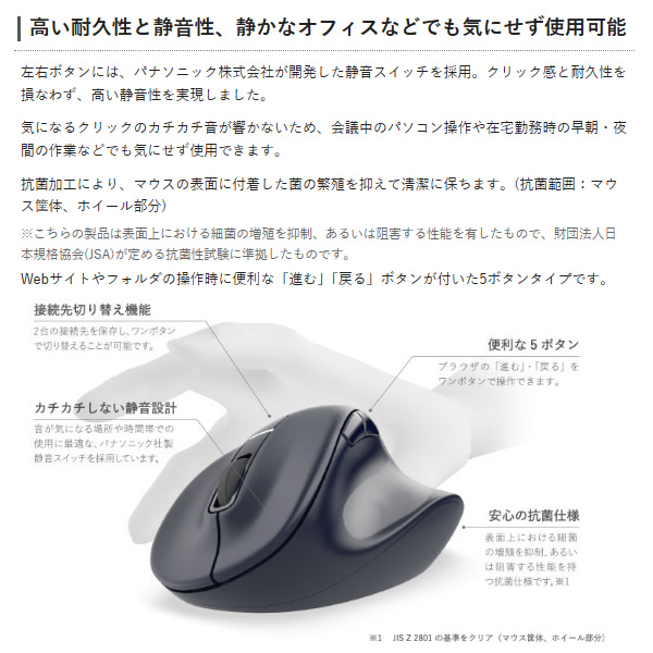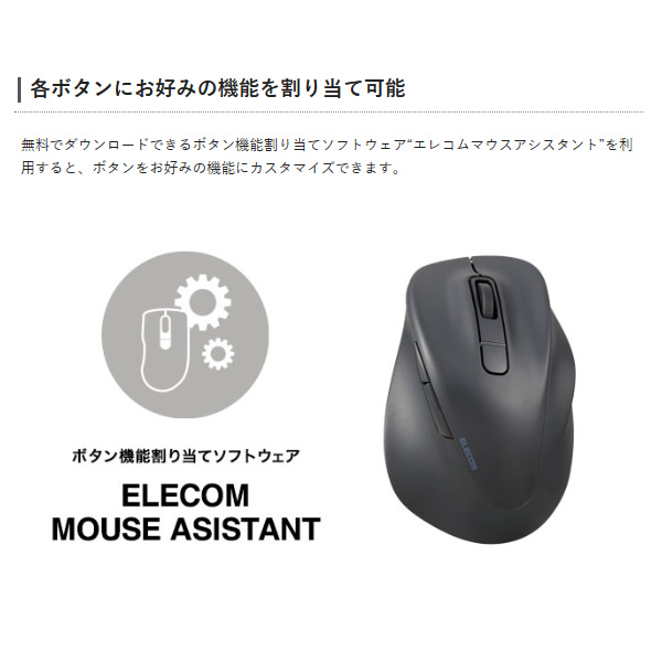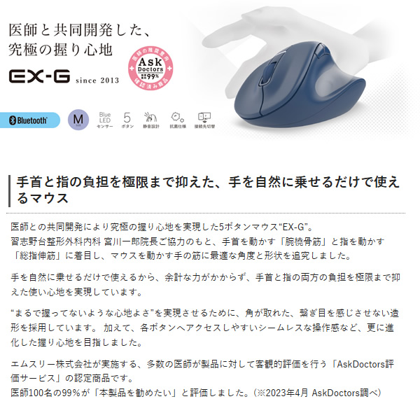 - ●接続方式:Bluetooth無線 ●Bluetooth規格:Bluetooth 5.0 Class2 ●対応プロファイル:HOGP(HID Over GATT Profile) ●対応機種:BluetoothHOGPに対応したWindows OS、Android、macOS、iOS、iPadOS、ChromeOS 搭載機 ●対応OS:Windows 11/10、Android 12、macOS Ventura 13、iOS 16、iPadOS 16、ChromeOS ●通信方式:GFSK方式 ●電波周波数:2.4GHz帯 ●電波到達距離:最長約10m ※ご使用環境により異なる場合があります。 ●接続先切替機能:対応(Bluetooth 2台) ●読取り方式:BlueLED ●センサー分解能:2000DPI ●ボタン数:5個 ※ホイールボタン含む ●ホイール数:1個 ●電源:単3形アルカリ乾電池、単3形マンガン乾電池、単3形ニッケル水素電池のいずれか1本 ●電池寿命:最長約16カ月(アルカリ乾電池使用時の目安) ※ご使用状況により異なる場合があります。 ●サイズ分類:Mサイズ ●外形寸法(幅×奥行×高さ):約75×114×55mm ●重量:約91g ※電池含まず ●内容物:マウス本体×1台、動作確認用単3形アルカリ乾電池×1本 ●カラー:ブラック●保証期間:2年間手首と指の負担を極限まで抑えた、手を自然に乗せるだけで使えるマウス 医師との共同開発により究極の握り心地を実現した5ボタンマウス“EX-G”。 習志野台整形外科内科 宮川一郎院長ご協力のもと、手首を動かす「腕橈骨筋」と指を動かす「総指伸筋」に着目し、マウスを動かす手の筋に最適な角度と形状を追究しました。 手を自然に乗せるだけで使えるから、余計な力がかからず、手首と指の両方の負担を極限まで抑えた使い心地を実現しています。 “まるで握ってないような心地よさ”を実現させるために、角が取れた、繋ぎ目を感じさせない造形を採用しています。 加えて、各ボタンへアクセスしやすいシームレスな操作感など、更に進化した握り心地を目指しました。 エムスリー株式会社が実施する、多数の医師が製品に対して客観的評価を行う「AskDoctors評価サービス」の認定商品です。 医師100名の99%が「本製品を勧めたい」と評価しました。(※2023年4月 AskDoctors調べ) 手を自然に乗せるだけで使える角度と形状 「AscDoctors評価サービス」認定を取得。 どんな手にもフィットする4サイズ展開 どんな手のサイズの方にもフィットするように、S/M/L/XLの4サイズをご用意しました。中指の先端から手のひらの下までの長さが165~180mmの方にピッタリとフィットするMサイズです。 高い耐久性と静音性、静かなオフィスなどでも気にせず使用可能 左右ボタンには、パナソニック株式会社が開発した静音スイッチを採用。クリック感と耐久性を損なわず、高い静音性を実現しました。 気になるクリックのカチカチ音が響かないため、会議中のパソコン操作や在宅勤務時の早朝・夜間の作業などでも気にせず使用できます。 抗菌加工により、マウスの表面に付着した菌の繁殖を抑えて清潔に保ちます。(抗菌範囲:マウス筐体、ホイール部分) ※ こちらの製品は表面上における細菌の増殖を抑制、あるいは阻害する性能を有したもので、財団法人日本規格協会(JSA)が定める抗菌性試験に準拠したものです。 Webサイトやフォルダの操作時に便利な「進む」「戻る」ボタンが付いた5ボタンタイプです。 各ボタンにお好みの機能を割り当て可能 無料でダウンロードできるボタン機能割り当てソフトウェア“エレコムマウスアシスタント”を利用すると、ボタンをお好みの機能にカスタマイズできます。 接続先切り替え機能を搭載したBluetooth®タイプ ワイヤレスでデスク周りをすっきりと使えるBluetooth®接続タイプです。最大2台のBluetoothマウス対応機器に接続可能な接続先切り替え機能を搭載しています。 本体上部のボタンで簡単に接続先を切り替えられるため、家ではパソコン、外ではタブレットなど、複数のデバイスを併用している方におすすめです。 Bluetooth®HOGPに対応したパソコンであれば、レシーバーを接続することなくマウスを使用できるため、USBポートの少ないパソコンやタブレットにぴったりです。 ※ Bluetooth®HOGPに対応していないパソコンでも、規格に適合したBluetooth®アダプターを用意することで使用可能です。(推奨Bluetoothアダプター:LBT-UAN05C2 シリーズ(別売)) BlueLEDセンサー搭載 小さい凹凸やホコリがある環境でも正確にポインターを動かせる“BlueLEDセンサー”を搭載することで、木材・樹脂・ガラス製のデスクや、ノート、テーブルクロスの上などでも快適に操作できます。 各部名称と特長 メーカー環境認定基準を1つ以上満たし、『THINK ECOLOGY』マークを表示した製品です。 「THINK ECOLOGY」マークは、従来よりも“より環境負荷が少ない”製品であることを示すシンボルとして制定しています。エレコムグループでは、その対象となる製品をより多くつくり、マーク表示を行い、積極的にお客様に選んでいただけるよう努力を続けて参ります。