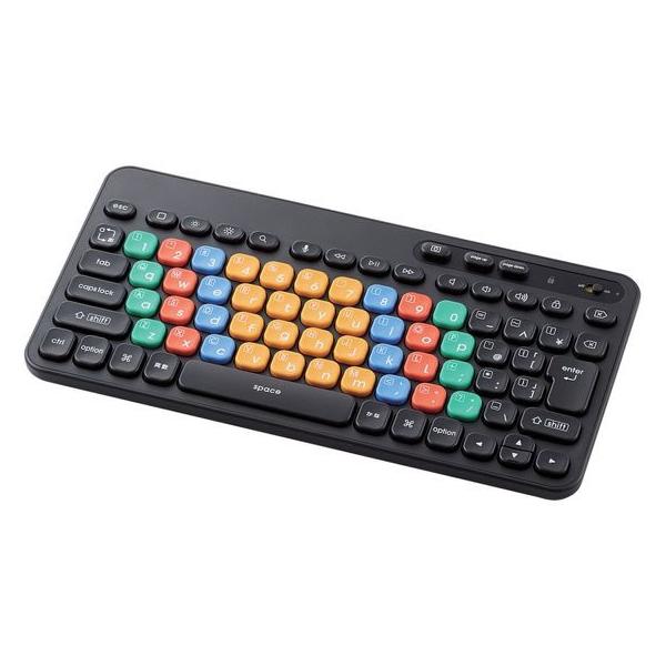 - 【返品種別A】□「返品種別」について詳しくはこちら□2023年05月 発売メーカー保証期間 1年◆正しいキー入力が楽しく覚えられる“KEY PALETTO(キーパレット)”正しいキー入力が楽しく覚えられる、パソコン学習用キーボード“KEY PALETTO(キーパレット)”です。◆はじめてのキーボードにぴったり実際に入力される文字と同じ印字デザインで、アルファベットに不慣れな子どもたちの混乱を防ぎます。◆キーボードの使い方を楽しく学べる原色に近いわかりやすい配色で、キーを打つ指が楽しく覚えられます。色の判別が苦手な色覚特性のある方でも、色の違いを見分けやすいカラーバランスに調整しています。◆子どもたちが「キーをカタカタ打てる」体験をサポート子どもの手の大きさに合わせた、タブレットなどでも使用しやすい17mmピッチのコンパクト設計です。使用頻度や機能などによってキー形状に変化をつけることで、これからタッチタイピングを学ぶ子どもたちが押し間違えしにくくなる工夫をこらしました。押し間違いによる混乱を避けるため、使用頻度の低い機能を排除することにより、より楽しくキーボード操作を学習できるよう配慮しました。◆お手本のカードでローマ字入力の習得をサポート付属のローマ字入力サポートカードや、メモなどを立てかけられるカードスタンド付きです。カードスタンドにピッタリサイズのオリジナルカードを作成できるテンプレートや、Scratchなどの学習に便利な専用カードのデータを無料で公開しています。◆いたずらにも強く長く使える設計最大500万回の打鍵に耐える丈夫なキーを採用しています。キーのすき間にペンの先端や定規を差し込みにくく、いたずらにも強い構造です。◆混乱の元となるCaps Lock機能を無効化するスイッチつき気づかないうちに押して有効にしてしまいやすいCaps Lock機能を、スイッチのON/OFFによって無効にする“Caps Lock機能無効化スイッチ”を搭載しています。“Caps Lock機能無効化スイッチ”は、小さな指でも操作しやすく、ロック状態がひとめでわかるスイッチを採用しています。◆習熟度にあわせて貼ってはがせるよみがなシールキーボードに貼って、キーの名前や読み方を覚えられる“よみがなシール”付きです。キーに貼っても手触りがほとんど変わらず、覚えたらはがせる高品質なシールを採用しました。◆小学校・高等学校におけるプログラミング教育の策定に携わる 兼宗 進 先生 監修本製品は、プログラミング言語の開発や指導方法などを、幅広く研究・提案されている、大阪電気通信大学の兼宗進副学長(2023年5月現在)に監修いただいた製品です。◆その他特徴・本体色は、汚れや傷が目立ちにくいチャコールブラックを採用しています。・軽い力でもサクサクと打てる新設計のメンブレン方式を採用しています。・プログラミングやパソコン学習に特化した機能を盛り込んだ、独自の配列を採用しています。・ころんとした丸みを帯びたキー形状と、なじみのよい手ざわりで子どもたちが親しみを感じられるよう仕上げました。・本体裏面にお名前スペースを設け、紛失や取り間違えを防止します。・本体に約10度の傾斜をつけられるキーボードスタンドにより、キーを打ちやすくし、手や腕への負担がかかりにくくなります。・Bluetooth Low Energyに対応したiPhoneやiPadにワイヤレス接続ができます。・本体の表面には、使わないときに電源をオフにできるスイッチがあり、不使用時の電池の消耗を防止できます。・抗菌加工によって、菌の繁殖を抑え、清潔に保ちます。(抗菌範囲:キーボード筐体、印刷部分)※こちらの製品は表面上における細菌の増殖を抑制、あるいは阻害する性能を有したもので、財団法人日本規格協会(JSA)が定める抗菌性試験に準拠したものです。・キーボード上部にあるマルチファンクションキーは、iOS、iPadOSでの使用に便利な仕様です。■ 仕 様 ■接続方式:Bluetooth無線Bluetooth規格:Bluetooth 5.1 Class2対応プロファイル:HOGP(HID Over GATT Profile)対応機種:iPad、iPhone対応OS(iOS):iOS 16対応OS(iPadOS):iPadOS 16通信方式:GFSK方式電波周波数:2.4GHz帯電波到達距離:最長約10m ※ご使用環境により異なる場合があります。キー配列:日本語配列キー数:84キーキータイプ:メンブレンキーピッチ:17mmキーストローク:2.5mmマルチファンクション機能:あり電源:単3形アルカリ乾電池、単3形マンガン乾電池、単3形ニッケル水素2次電池のいずれか1本電池寿命:最長約2年(アルカリ乾電池使用時の目安) ※ご使用状況により異なる場合があります。サイズ分類:ミニサイズ外形寸法:幅約267mm×奥行約136mm×高さ約23mm(スタンド含まず)、幅約267mm×奥行約136mm×高さ約33mm(スタンド時)重量:約310g ※電池含まず内容物:キーボード本体×1台、動作確認用単3形アルカリ乾電池×1本、ローマ字入力サポートカード×1枚、よみがなシール×1枚カラー:ブラック保証期間:1年間[TKFS10BMKIBK]パソコン周辺>マウス・キーボード>キーボード>無線>Bluetooth