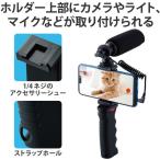 - ■手ブレを軽減しながら動画撮影ができるハンドグリップ付きスマートフォンホルダーです。 ■グリップには指にフィットする凹凸があり、マットな質感の滑りにくいノンスリップ仕様で、太さもあるので片手でしっかりと握れます。 ■ホルダー上部には、カメラやライト、マイクなど撮影に必要な機器が取り付けられる1/4ネジのアクセサリーシューが付いています。 ■ホルダー部は360度回転するので、自由に角度を調節できます。 ■ホルダー部にはスマートフォンのズレを防ぐ、すべり止めのクッションが付いています。 ■4.7〜6.7インチのスマートフォンに対応しています。 ■※スマートフォンがホルダーにしっかりと固定されているか、必ず確認してからご使用ください。 ■※防水仕様ではないため、雨天時などは使用しないでください。
