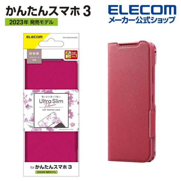 かんたんスマホ3 用 ソフトレザーケース 薄型 磁石付 フラワーズ ソフトレザー ケース カバー 手帳型 ディープピンク┃PM-K222PLFUJPND エレコム 在庫処分
