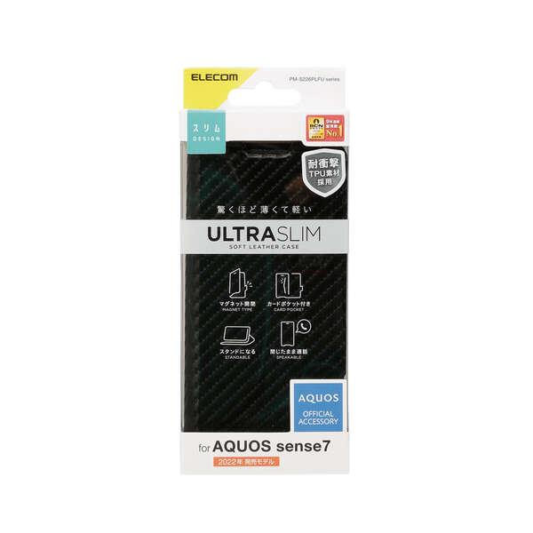 ELECOM AQUOS sense7 SH-53C SHG10 ソフトレザーケース 手帳型 カーボン調ブラック 薄型 磁石付 コーナーにエアクッションを使用 PM-S226PLFUCB