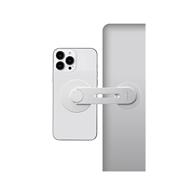 ・パソコンのディスプレイの背面に貼り付けて、iPhoneスタンドとして使用できるマグネット式ディスプレイアームスタンドです。MagSafeに対応しているiPhoneで使用できます。