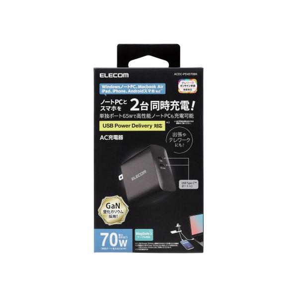 - 【商品解説】USB TypeC(TM)(USBC(TM))ポートを2ポート搭載し対応するスマートフォン、タブレット、ノートパソコンなどを充電できる、GaN(窒化ガリウム)を採用し小型で軽量なUSB AC充電器です。 ※USB Power Delivery規格65Wまでで充電できる機器に限ります。 出力端子が2ポートあるので、iPhoneなどのスマートフォンとWindowsなどのノートパソコンを2台同時充電できます。 ※2ポート同時出力時は合計最大70Wとなります。 USB TypeCポートは、USB Power Delivery規格に対応し、同規格に対応するノートパソコンやスマートフォン、タブレットなどを充電可能です。 USB TypeCポート単独使用時、機器に応じて出力が5V/3A、9V/3A、15V/3A、20V/3.25Aと可変し、iPhoneなどのスマートフォンから、iPadなどのタブレット、高性能なWindowsノートパソコンまで幅広く高速充電できます。 小型・軽量なので外出や出張などの際の持ち運びに便利です。 耐トラッキング性の要求事項(PSE:電気用品安全法)を満たしたコンセントプラグを採用しています。 USB Power Delivery(パワーデリバリー)とは、アダプターと接続機器間で情報をやり取りすることで、その機器間における最適な電力を選択し、高速充電を実現するUSB規格です。 本製品はUSBIFのテストと同等のテストを弊社独自で実施し、高い安全性が保たれており、USB Power Delivery対応製品にご使用いただけます。 ※本製品のUSB Power Delivery最大出力は65Wです。 ※本製品にケーブルは同梱しておりません。別途MFi認証品のUSB TypeC Lightningケーブルや、エレコムのUSB規格認証USB TypeC USB TypeCケーブル等をご用意ください。 ※機器本体や充電器が濡れた状態で充電すると、異常な発熱・焼損の原因となり大変危険ですのでおやめください。 ※USB TypeC and USBC are trademarks of USB Implementers Forum 自社環境認定基準を1つ以上満たし、『THINK ECOLOGY』マークを表示した製品です。 廃棄物削減に取り組み、製品に同梱する取扱説明書等をペーパーレス化した製品です。 環境保全に取り組み、製品の包装容器におけるプラスチック重量を、社内基準製品より20%以上削減した製品です。 環境保全に取り組み、製品の包装容器が紙・ダンボール・ポリ袋のみで構成されている製品です。【スペック】●型式:ACDC-PD4570BK(ACDCPD4570BK)●JANコード:4549550281690ポート数:2ポート充電規格:USB Power Delivery対応仕様1:■対応機種:各USB Type-C(TM)(USB-C(TM))ポートからUSB Power Delivery (65W)の規格内で充電が可能な機器。2ポート同時接続時、合計最大70Wまでの出力で充電、給電可能な機器とその組み合わせ。■コネクタ形状:USB Type-C(TM)(USB-C(TM))ポート×2■定格入力電圧:AC100〜240V、50/60Hz■定格入力電流:1.5A仕様2:■定格出力電力:単独接続時:USB Type-C1(TM)(USB-C1(TM))ポート最大出力20W、USB Type-C2ポート最大出力65W、2ポート同時接続時:合計最大出力70W、USB Type-C1ポート最大出力20W、USB Type-C2ポート最大出力50W■定格出力電圧:単独接続時:USB Type-C1(TM)(USB-C1(TM))ポート:5V/9V、USB Type-C2ポート:5V/9V/15V/20V、 2ポート同時接続時:USB Type-C1ポート:5V/9V、USB Type-C2ポート:5V/9V/15V/20V仕様3:■定格出力電流:単独接続時:USB Type-C1(TM)(USB-C1(TM))ポート:5V時3A、9V時2.22A、USB Type-C2ポート:5V/9V/15V時3A、20V時3.25A、2ポート同時接続時:USB Type-C1ポート:5V時3A、9V時2.22A、USB Type-C2ポート:5V/9V/15V時3A、20V時2.5A■外形寸法:幅約55mm×厚み約29.5mm×高さ約60mm■重量:約127g■カラー:ブラック■コンセントプラグ仕様:固定プラグ■使用温度:0℃〜25℃この商品は宅配便でお届けする商品です出荷可能日から最短日時でお届けします。※出荷完了次第メールをお送りします。配送サービス提供エリアを調べることができます「エリア検索」をクリックして、表示された画面にお届け先の郵便番号7桁を入力してください。ご購入可能エリア検索お買い上げ合計3,980円以上で送料無料となります。※3,980円未満の場合は、一律550円(税込)となります。●出荷可能日から最短日時でお届けします。(日時指定は出来ません。) ※お届け時に不在だった場合は、「ご不在連絡票」が投函されます。 「ご不在連絡票」に記載された宅配業者の連絡先へ、再配達のご依頼をお願いいたします。●お届けは玄関先までとなります。●宅配便でお届けする商品をご購入の場合、不用品リサイクル回収はお受けしておりません。●全て揃い次第の出荷となりますので、2種類以上、または2個以上でのご注文の場合、出荷が遅れる場合があります。詳細はこちら■商品のお届けについて商品の到着日については、出荷完了メール内のリンク(宅配業者お荷物お問い合わせサービス)にてご確認ください。詳しいお届け目安を確認する1度の注文で複数の配送先にお届けすることは出来ません。※注文時に「複数の送付先に送る」で2箇所以上への配送先を設定した場合、すべてキャンセルとさせていただきます。