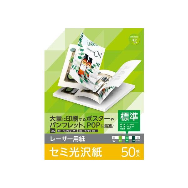 - 送料規定・納期はこちらでご確認下さい。【主な特長】レーザープリンタやコピー機で使える両面印刷可能なセミ光沢紙です。半光沢で上品な印象に仕上がるので企画書などのビジネス用途はもちろんポスターやカタログ印刷にも最適です。使いやすい標準的な厚みタイプです。■各社レーザープリンタ、複合機、コピー機に対応した専用紙です。 ■厚さ0.13mmの標準タイプで大量に印刷するポスターやパンフレット、POPなどに最適です。 ■専用紙ならではの再現性でオフセット印刷のような仕上がりが実現できます。 ■濃淡ムラを抑え、文字や写真が綺麗に表現できます。 ■反射を抑えたセミ光沢タイプで、両面に印刷できます。 ■自社環境認定基準を1つ以上満たし、『THINK ECOLOGY』マークを表示した製品です。 ■環境保全に取り組み、製品の包装容器が紙・ダンボール・ポリ袋のみで構成されている製品です。■用紙サイズ:A4サイズ(210mm×297mm) ■用紙枚数:50枚入り ■用紙タイプ:レーザープリンタ専用紙(セミ光沢、標準、両面) ■白色度:86% ■紙厚:0.13mm ■坪量:157g/m2 ■お探しNo.:D355