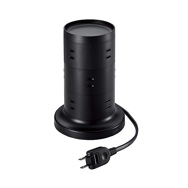 ・比較的小さな面積でができ、360度あらゆる方向から接続できる12個の差込口を備えたタワー型の電源タップです。製品上部はトレー形状になっており、一時的に取り外した充電器などの小物を収納しておくことができます。二重構造の差込口やホコリ防止シャッターなどの安全機能、雷ガードやスイングプラグなどの便利機能を備えた使いやすい製品です。