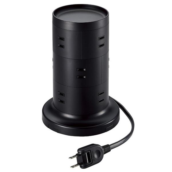 - 【商品解説】12個の差込口を備えたタワー型の電源タップです。 タワー型のため、差込口が多くても小さな面積で設置でき、360度あらゆる方向から接続できるので、会議室のデスクなどでの使用に便利です。 製品上部はトレー形状になっており、一時的に取り外した充電器などの小物を収納しておくことができます。 AC差込口には未使用時にホコリの侵入を防止する「ホコリ防止シャッター」を搭載しています。 差込口は耐熱性に優れた熱硬化性樹脂を使用した二重構造になっており、万が一の発熱の際にも融解しにくく、電気火災の防止に有効です。 刃受け金具には繰り返しの使用でも変形しにくい0.8mm厚を採用しています。プラグの保持力が低下しにくく、発熱を抑制します。 差込口は階層ごとに45度ずらした配置になっているため、大きなACアダプターなどでも、互いに干渉せずに差し込めます。 最大12500V(JEC210/212規格に基づく数値)までの誘導雷による雷サージから、接続機器を保護する雷ガード機能を搭載しています。 ※直撃雷や、誘導雷であっても素子の許容値を超える雷サージが発生した場合、接続機器を保護できない場合があります。また、受けた電圧や回数により性能は劣化します。 本体底面に収納された脚パーツを引き出すことで、接続したアダプターなどで重量バランスが偏っていても、安定して設置することができます。 脚パーツには滑り止めを装備し、接続されたコードなどが引っ張られた際にも本体が横滑りしにくくなっています。 底面にはダルマ穴を備えており、壁などに設置したネジに引っ掛けて利用することができます。 電源コードは下方向への取り出しの他、底面の溝を利用して横方向にも取り出せます。 電源コードを横から取り出すための溝は、搭載されたパーツでフタをすることができます。 電源コードには一般社団法人日本配線システム工業会規格(JWDS0010)に適合した二重被ふくコードを採用し、断線や被ふく破れによる感電・火災の防止に有効です。 柔軟で取り回しがしやすい、並行2芯線の平型コードです。 狭い場所でも配線しやすい180度スイングプラグを採用しています。 プラグには栓刃間に火災の原因となるトラッキング現象防止に有効な熱硬化性樹脂を配し、感電の危険を抑制する絶縁スリーブを装備しています。 自社環境認定基準を1つ以上満たし、『THINK ECOLOGY』マークを表示した製品です。 環境保全に取り組み、製品の包装容器におけるプラスチック重量を、社内基準製品より20%以上削減した製品です。【スペック】●型式:TT-03-1220BK(TT031220BK)●JANコード:4549550285469雷対策:雷対策有仕様1:■差込口仕様:Aタイプ 2ピン■差込口個数:12個口■プラグ仕様:Aタイプ 2ピン■ACコード長:約2.0m■定格:15A 125V 1500Wまで■極性対応:×■スイッチ:×■雷ガード:○■ほこりシャッター:○■抜け止め機能:×■差込口キャップ:×■通電表示ランプ:×■二重構造:○■二重被ふく:○■絶縁キャッププラグ:○■スイングプラグ:○仕様2:■マグネット:×■吊り穴:○■ブレーカー:×■ノイズフィルター:×■モジュラージャック:×■連動機能:×■変換アダプタ:×■カラー:ブラック■材質:本体:ポリカーボネート樹脂 差込口:ユリア樹脂 プラグ:PVC樹脂■外形寸法:幅約130mm×奥行約130mm×高さ約185mm ※本体のみ(突起部を除く)■質量:約681g■付属品:取扱説明書■使用可能地域:日本国内専用仕様3:■法規:◇PSE 特定電気用品■保証期間:1年間■その他:小物が置けるトレー搭載この商品は宅配便でお届けする商品です出荷可能日から最短日時でお届けします。※出荷完了次第メールをお送りします。配送サービス提供エリアを調べることができます「エリア検索」をクリックして、表示された画面にお届け先の郵便番号7桁を入力してください。ご購入可能エリア検索お買い上げ合計3,980円以上で送料無料となります。※3,980円未満の場合は、一律550円(税込)となります。●出荷可能日から最短日時でお届けします。(日時指定は出来ません。) ※お届け時に不在だった場合は、「ご不在連絡票」が投函されます。 「ご不在連絡票」に記載された宅配業者の連絡先へ、再配達のご依頼をお願いいたします。●お届けは玄関先までとなります。●宅配便でお届けする商品をご購入の場合、不用品リサイクル回収はお受けしておりません。●全て揃い次第の出荷となりますので、2種類以上、または2個以上でのご注文の場合、出荷が遅れる場合があります。詳細はこちら■商品のお届けについて商品の到着日については、出荷完了メール内のリンク(宅配業者お荷物お問い合わせサービス)にてご確認ください。詳しいお届け目安を確認する1度の注文で複数の配送先にお届けすることは出来ません。※注文時に「複数の送付先に送る」で2箇所以上への配送先を設定した場合、すべてキャンセルとさせていただきます。