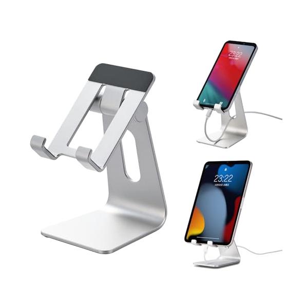 - ■スマートフォンやタブレット、NINTENDO SWITCH(TM)、NINTENDO SWITCH(TM)(有機ELモデル)、NINTENDO SWITCH(TM) Liteを充電しながら使用できる、角度調節が可能なフリーアングルスタイルのアルミスタンドです。Webサイトの閲覧や動画視聴、ゲームプレイなどシーンに合わせてお好きな角度で使用可能。光沢が美しいアルミ素材で、インテリアになじみやすいシンプルなデザインです。■スマートフォン、タブレット、NINTENDO SWITCH(TM)、NINTENDO SWITCH(TM)(有機ELモデル)、NINTENDO SWITCH(TM) Liteを充電しながら使用できる、自由に角度調節が可能なフリーアングルスタイルのアルミスタンドです。 ■4.6〜8.3インチのスマートフォンやタブレット、NINTENDO SWITCH(TM)、NINTENDO SWITCH(TM)(有機ELモデル)、NINTENDO SWITCH(TM) Liteに対応しています。 ■Webサイトの閲覧や動画視聴、ゲームプレイなどシーンに合わせて角度を調節し、お好きな位置で固定して使用できます。 ■光沢が美しいアルミ素材で、インテリアになじみやすいシンプルなデザインです。 ■ホルダー部の面積が広いので大型のスマートフォンも安定して設置できます。 ■ホルダー部の中心が開いているので、機器本体を設置したまま充電ができます。 ■ホルダー部には、機器本体のズレを防ぐシリコン素材の滑り止めが付いています。 ■スタンドアーム部のケーブルホールにケーブルを通すことで、キレイに配線ができます。 ■スタンド底面には、滑りにくく安定して設置できるシリコン素材の滑り止めが付いています。 ■※スタンドに設置後、機器本体をタップするなどしてスタンドが倒れないか、必ず確認してからご使用ください。 ■自社環境認定基準を1つ以上満たし、『THINK ECOLOGY』マークを表示した製品です。 ■環境保全に取り組み、製品の包装容器におけるプラスチック重量を、社内基準製品より20%以上削減した製品です。■材質:アルミニウム、シリコン■外形寸法:幅約70mm×奥行約95mm×高さ約120mm(収納時)■重量:約142g■カラー:シルバー■対応機種:4.6〜8.3インチのスマートフォンやタブレット(幅約79mm×奥行約15mm×高さ約161mmまで)、NINTENDO SWITCH(TM)、NINTENDO SWITCH(TM)(有機ELモデル)、NINTENDO SWITCH(TM) Lite■角度調節:○エレコムダイレクトショップ