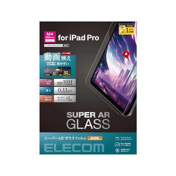 - スーパーAR加工により透過率をアップ。動画視聴の際などに光の映り込みに邪魔されずに視聴することができる11インチiPad Pro(M4)用超透明タイプのガラスフィルムです。■動画視聴に最適透過率を増加させることで反射率を軽減する加工を施したガラスフィルムです。透過率増加とガラス面への光の映り込みの軽減により、コントラストの強化と画面の見やすさを実現しました。■ガラス特有の、美しい透明度と、なめらかな指滑り「リアルガラス」を採用した“液晶保護ガラス”です。美しい透明度と、ガラス特有のなめらかな指すべりを実現しました。■高耐久特殊コーティングにより指すべり長持ち。滑らかな指すべりを長く維持し続ける高耐久特殊コーティングを施しています。■特殊な飛散防止設計により、高い安全性を実現。特殊な飛散防止設計により、万一割れてしまった際にも飛散することなく、高い安全性を実現。■指のひっかかりが少ない握ったときやかばんから取り出すときにも引っかかりにくいように、エッジに丸みをもたせた「ラウンドエッジ加工」を施しています。■指紋が付きにくく簡単に拭き取れるフィルム表面の指紋防止加工により、指紋が付きにくく残った場合でも簡単に拭き取れます。タッチ操作をしても指紋が目立ちにくくなっています。■写真・動画がきれいに見える高い光線透過率のため、画質を損ねない透明感です。写真や動画の色がきれいに見えます。■入った気泡が24時間後に消える貼る際に気泡が入りにくく、入った場合でも時間の経過とともに気泡が分散され目立たなくなります。また、小さなホコリ等を吸収し画面に気泡が残りません。■失敗しても貼り直しができるシリコン素材の吸着面により、フィルムをはがしても吸着力を損ねずに貼り直すことが可能です。■置くだけで自然に貼り付き貼りやすい自己吸着加工により、フィルムを置くだけで自然と画面に貼り付きます。■高硬度加工により傷に強い表面硬度10H(※)の強化ガラスを採用し、割れにくく、安心。※エレコム社基準による10H鉛筆硬度試験実施