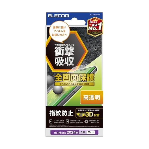 エレコム iPhone 16 Pro フィルム グレア 光沢 指紋がつかない 全面保護 衝撃吸収 ハードコート加工 PM-A24CFLFPRG