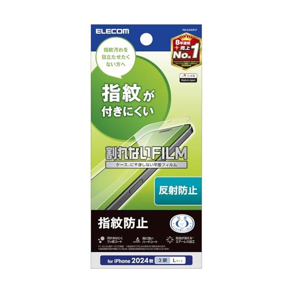 - エレコム iPhone 16 Pro Max フィルム アンチグレア マット 指紋がつかない 反射防止 ハードコート加工 気泡が入らない PM-A24DFLF 端末の画面を傷や汚れから守る、指紋防止、反射防止タイプの画面保護フィルムです。 光の映り込みを抑え、見やすい画面を実現する反射防止タイプです。 フィルムに抗菌機能を施し、細菌の繁殖を防ぎます。 こちらの製品は表面上における細菌の増殖を抑制、あるいは阻害する性能を有したもので、JSA(財団法人日本規格協会)が定める抗菌性試験に準拠したものです。 ※抗菌とは、製品の表面上に存在する細菌の増殖を抑制することです。JIS(日本産業規格)では抗菌加工されていない製品の表面と比較して、細菌を99%以上抑制出来ている場合、その製品に抗菌効果があると規定しています。 【 仕様 】 ■対応機種:iPhone 16 Pro Max ■セット内容:画面保護フィルム(指紋防止、反射防止仕様)×1、クリーニングクロス(乾式)×1、ホコリ取りシール×1 ■材質:接着面:シリコン、外側:PET 【 説明 】 ■端末の画面を傷や汚れから守る、指紋防止、反射防止タイプの画面保護フィルムです。 ■光の映り込みを抑え、見やすい画面を実現する反射防止タイプです。 ■フィルムに抗菌機能を施し、細菌の繁殖を防ぎます。 ■こちらの製品は表面上における細菌の増殖を抑制、あるいは阻害する性能を有したもので、JSA(財団法人日本規格協会)が定める抗菌性試験に準拠したものです。 ■ ※抗菌とは、製品の表面上に存在する細菌の増殖を抑制することです。JIS(日本産業規格)では抗菌加工されていない製品の表面と比較して、細菌を99%以上抑制出来ている場合、その製品に抗菌効果があると規定しています。 ■指紋 ■皮脂汚れが付きにくく、残った場合でも簡単に拭き取れる指紋防止加工を施しています。 ■ハードコート加工により、フィルム表面の傷を防止します。 ■時間の経過とともに気泡が目立たなくなる、特殊吸着層を採用したエアーレスタイプです。 ■貼り付け面にシリコン皮膜をコーティングし、接着剤や両面テープを使わずに貼り付け可能な自己吸着タイプです。貼りやすく、貼り直しも可能です。 ■小さな気泡ができたときには、指などで押し出すことで気泡を抜くことができます。 ■端末の形状に合わせたサイズにカット済みなので、パッケージから取り出してすぐに使用可能です。 ■ ※画面の端が湾曲しているため、表示画面の幅よりも小さい仕様にしています。 ■フィルムを装着した状態でFace ID機能を利用する場合は、フィルム装着後にFace IDの再登録を行ってください。 ■フィルムがキレイに貼れる、クリーニングクロス、ホコリ取りシールが付属しています。 ■自社環境認定基準を1つ以上満たし、『THINK ECOLOGY』マークを表示した製品です。 ■廃棄物削減に取り組み、製品に同梱する取扱説明書等をペーパーレス化した製品です。 ■環境保全に取り組み、製品の包装容器が紙 ■ダンボール ■ポリ袋のみで構成されている製品です。 【商品に関するお問い合わせ】 エレコム総合インフォメーションセンター TEL. 0570-084-465 FAX. 0570-050-012 受付時間 / 10:00~19:00 年中無休 商品コード34080333778商品名エレコム iPhone 16 Pro Max フィルム アンチグレア マット 指紋がつかない 反射防止 ハードコート加工 気泡が入らない PM-A24DFLF型番PM-A24DFLFカラーマット※他モールでも併売しているため、タイミングによって在庫切れの可能性がございます。その際は、別途ご連絡させていただきます。※他モールでも併売しているため、タイミングによって在庫切れの可能性がございます。その際は、別途ご連絡させていただきます。