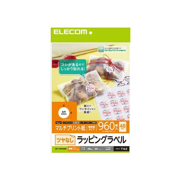 - 概要■お菓子や雑貨のラッピング、結婚式や誕生日パーティーの招待状などに使えるオリジナルラベルシールを自分でデザイン・印刷して作成できます。 ■落ち着いた質感のマット紙を採用。手書きも印刷も可能です。 ■丸型にカットされていて、台紙から剥がしやすいので効率よくラベル貼り作業を行えます。 ■0.13mmのしっかりコシがあるラベルの厚みで、商品のパッケージシールやビンの表示ラベルなど幅広い用途に使えます。 ■無料でダウンロードできるエレコムのラベル作成ソフト「らくちんプリント3.0」を使って、簡単にデザイン・印刷が可能です。 ■インクジェットプリンタ顔料と染料に対応。他にもレーザープリンタ、コピー機でも利用可能です。 ■環境保全に取り組み、製品の包装容器が紙・ダンボール・ポリ袋のみで構成されている製品です。仕様■用紙サイズ:幅210mm×高さ297mm ※A4サイズ■一面サイズ:30mm×30mm(丸型)■ラベル枚数:20シート(960片)■用紙タイプ:上質紙 マット プリンタ兼用タイプ■カラー:ホワイト■紙厚:0.13mm■坪量:180g/m2■テストプリント用紙:テストプリント用紙1枚入り■お探しNo.:T163■その他:面付48面備考※メーカー取り寄せ商品となりますので、ご注文後の注文キャンセルはお承りできません。※メーカー取り寄せ商品となりますので、返品交換は一切お受けいたしかねます。ただし初期不良の場合でメーカーに在庫が確認できる場合は交換にて対応致します。※商品開梱後は組み立てやご使用の前に、コンディション・付属品類が揃っていることをご確認ください。 お客様の都合による返品・交換はお受けできませんので、ご注意ください。※掲載商品は、メーカー都合により予告無く仕様を変更(商品名やパッケージを含む)する場合があります。そのため、掲載内容(商品名・商品説明・商品画像等)はお届けする品物と異なる場合がございます。※メーカー取り寄せ商品となりますので、メーカー欠品の場合はご注文をキャンセルさせていただきます。あらかじめご了承ください。※取り寄せ品のため納期が前後する場合がございます。あらかじめご了承下さい。