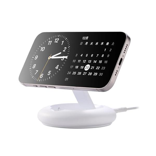 ・マグネットで固定するだけでQi2対応スマートフォンを高速充電できる、Qi2規格ワイヤレス充電スタンドです。最大出力15WでiPhoneを充電できます。