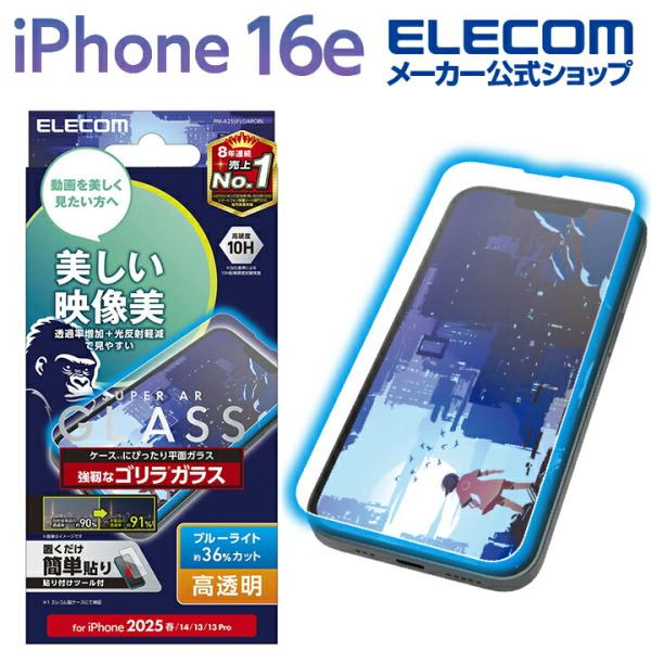 iPhone 16e 用 ガラスフィルム 動画映え ゴリラ0.21mm ブルーライトカット iPhone16e iPhone14/13/13pro 保護フィルム PM-A25SFLGAROBL エレコム 在庫処分